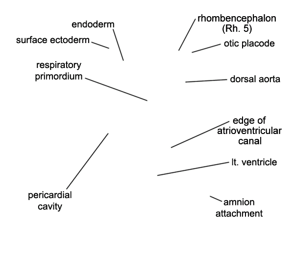 Keywords: amnion attachment, dorsal aorta, edge of atrioventricular canal, endoderm, left ventricle, otic placode, pericardial cavity, respiratory primordium, rhombencephalon (Rh. 5), surface ectoderm