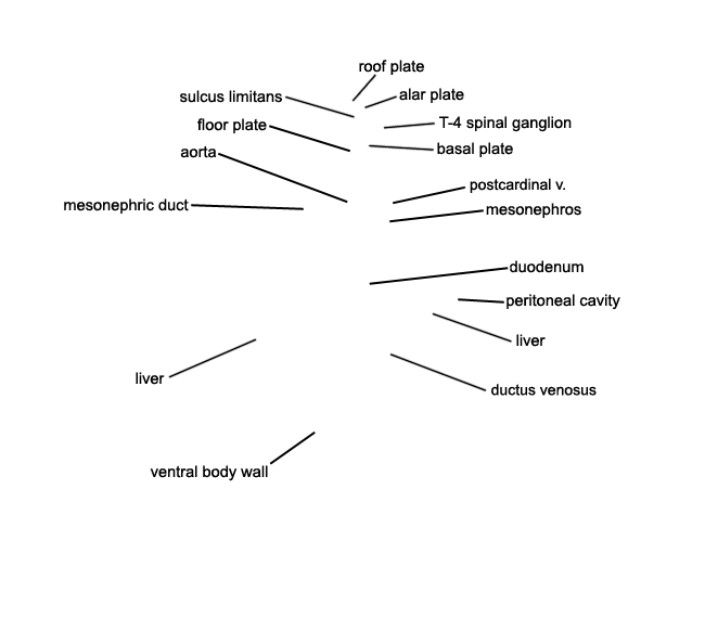 Keywords: T-4 spinal ganglion, alar plate(s), aorta, basal plate, ductus venosus, duodenum, floor plate, liver, mesonephric duct, mesonephros, peritoneal cavity, postcardinal vein, roof plate, sulcus limitans, ventral body wall