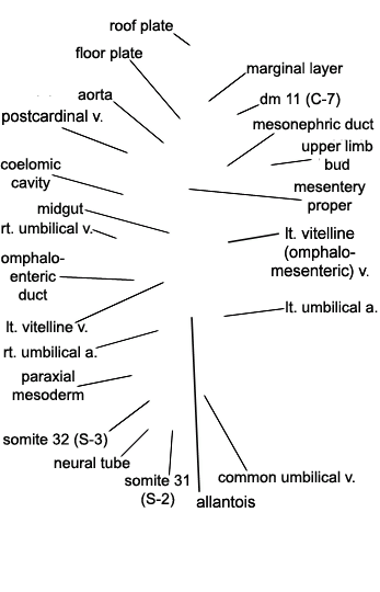 Keywords: allantois, aorta, coelomic cavity, common umbilical vein, dermatomyotome 11 (C-7), floor plate, left umbilical artery, left umbilical vein, left vitelline (omphalomesenteric) vein, marginal layer, mesentery proper, mesonephric duct, midgut, neural tube, omphaloenteric duct, paraxial mesoderm, postcardinal vein, right umbilical artery, right umbilical vein, roof plate, somite 31 (S-2), somite 32 (S-3), upper limb bud