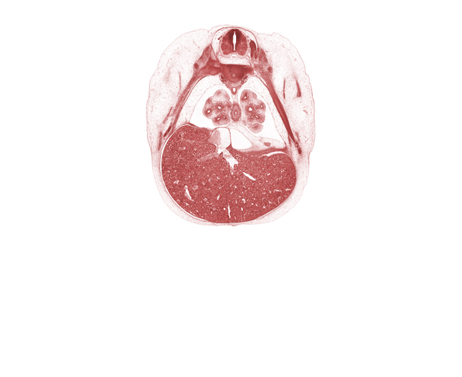 Keywords: T-6 intercostal nerve, T-6 spinal ganglion, aorta, central canal, inferior vena cava, junction of efferent hepatic veins and inferior vena cava, lateral basal tertiary bronchus of right lung, left efferent hepatic vein, lingula of upper lobe of left lung, liver prominence, lower lobe of left lung, medial basal tertiary bronchus of right lung, oblique fissure, pulmogenic coat, rib 7, rib 8, right efferent hepatic vein, sympathetic trunk