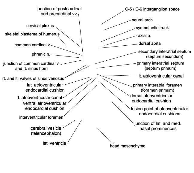 Keywords: C-5 / C-6 interganglion region, axial artery, cerebral vesicle (telencephalon), cervical plexus, common cardinal vein, dorsal aorta, dorsal atrioventricular endocardial cushion, fusion point of atrioventricular endocardial cushions, head mesenchyme, interventricular foramen, junction of common cardinal vein and right sinus horn, junction of lateral and medial nasal prominences, junction of postcardinal and precardinal veins, lateral atrioventricular endocardial cushion, lateral ventricle, left atrioventricular canal, neural arch, phrenic nerve, primary interatrial foramen (foramen primum), primary interatrial septum (septum primum), right and left valves of sinus venosus, right atrioventricular canal, secondary interatrial septum (septum secundum), skeletal blastema of humerus, sympathetic trunk, ventral atrioventricular endocardial cushion