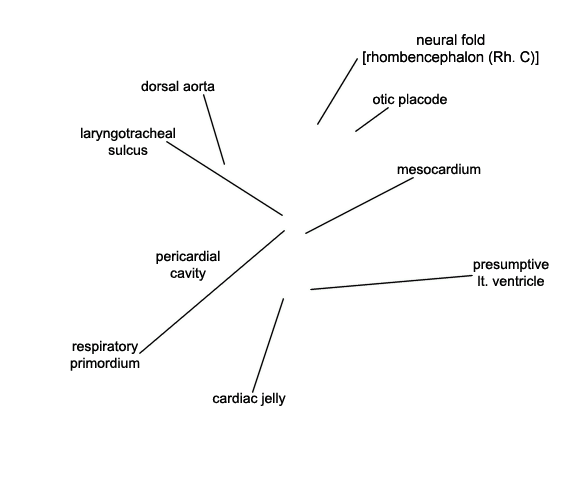 Keywords: cardiac jelly, dorsal aorta, laryngotracheal sulcus, mesocardium, neural fold [rhombencephalon (Rh. C)], otic placode, pericardial cavity, presumptive left ventricle, respiratory primordium