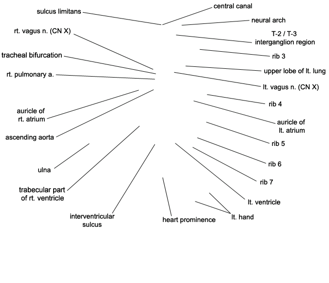 Keywords: T-2 / T-3 interganglion region, ascending aorta, auricle of left atrium, auricle of right atrium, central canal, heart prominence, interventricular sulcus, left hand, left vagus nerve (CN X), left ventricle, neural arch, rib 3, rib 4, rib 5, rib 6, rib 7, right pulmonary artery, right vagus nerve (CN X), sulcus limitans, trabecular part of right ventricle, tracheal bifurcation, ulna, upper lobe of left lung