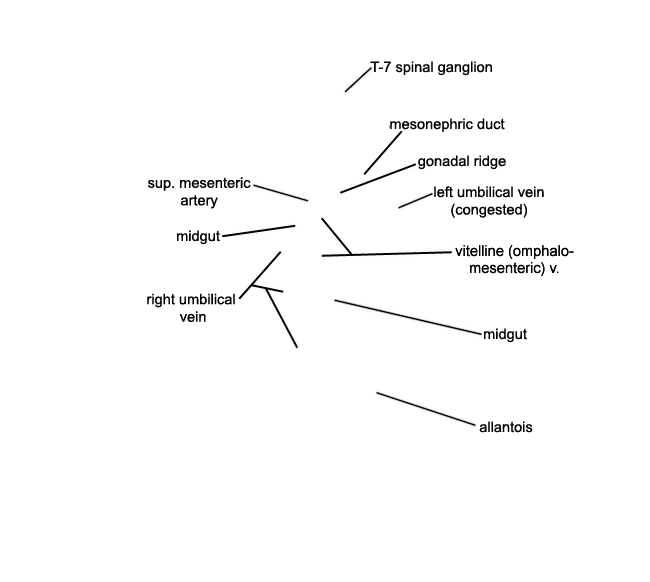 Keywords: T-7 spinal ganglion, allantois, gonadal ridge, left umbilical vein (congested), mesonephric duct, midgut, right umbilical vein, superior mesenteric artery, vitelline (omphalomesenteric) vein
