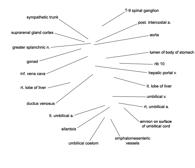 Keywords: T-9 spinal ganglion, allantois, amnion on surface of umbilical cord, aorta, ductus venosus, gonad, greater splanchnic nerve, hepatic portal vein, inferior vena cava, left lobe of liver, left umbilical artery, lumen of body of stomach, omphalomesenteric vessels, posterior intercostal artery, rib 10, right lobe of liver, right umbilical artery, suprarenal gland cortex, sympathetic trunk, umbilical coelom, umbilical vein