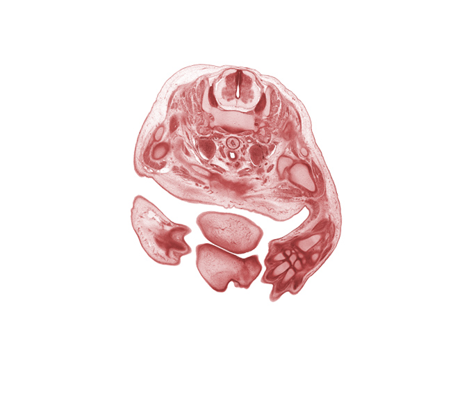 Keywords: C-2 dorsal root, C-2 spinal ganglion, anterior communicating artery, artifact separation(s), atlanto-occipital joint, basi-occipital (basal plate), basisphenoid, dens of C-2 vertebra (axis), edge of cochlear duct, edge of pharynx, facial nerve (CN VII), hypoglossal nerve (CN XII), inferior ganglion of glossopharyngeal nerve (CN IX), internal jugular vein, lateral ventricle, malleus cartilage, maxillary nerve (CN V₂), maxillary vein, olfactory bulb, optic nerve (CN II), osteogenic layer, semispinalis cervicis muscle, upper eyelid, vagus nerve (CN X), vertebral artery