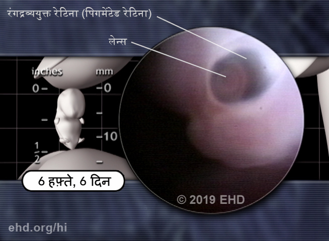 The human eye at this stage shows considerable similarity to the newborn and adult eye. Here you can see the developing lens and anterior chamber, behind which the relatively large posterior chamber is seen.