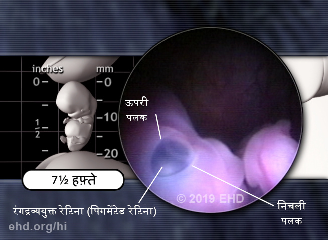 Within the posterior chamber of the eye, you can see the dark pigment of the human retina. Though not yet in final form, it has already been in place for weeks!48 You can also clearly see the early upper and lower eyelids. At this point, the eyelids begin to rapidly cover the entire surface of the eye and will soon fuse together.