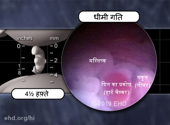 FROM THE SCRIPT: “Here you can see her beating heart in slow motion just 4½ weeks after fertilization. Do you see how her heart changes color as blood enters and leaves its chambers with each beat?”